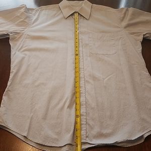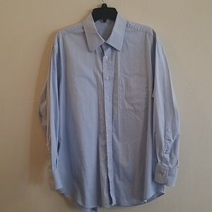 Size large. Unbranded Blue button-down. Cotton synthetic blend. Just needs a good iron and it is like brand new all over again. Excellent condition. Fabric is fresh and just needs to be ironed. Machine washable.