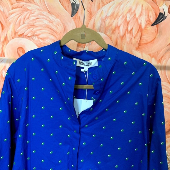 Blue button up with long sleeves and green and white polka dot print from Diane Von Furstenburg