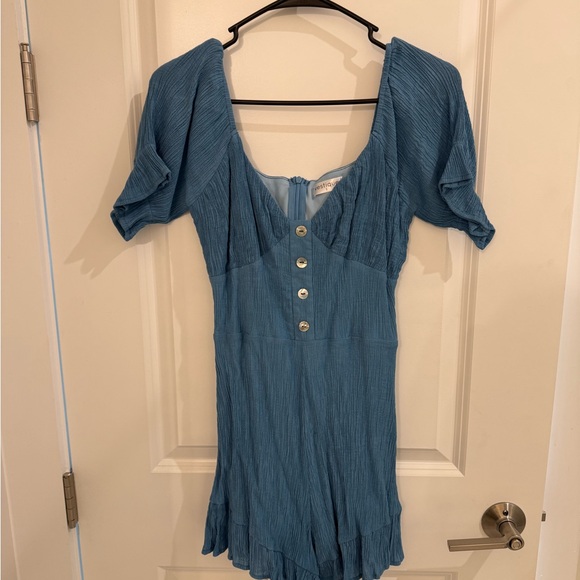 Stylish blue romper with button-front detail. Features short sleeves and a pleated hem.