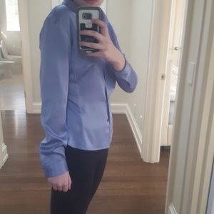 beaitiful blue button-up blouse model is a size 4, 5'8