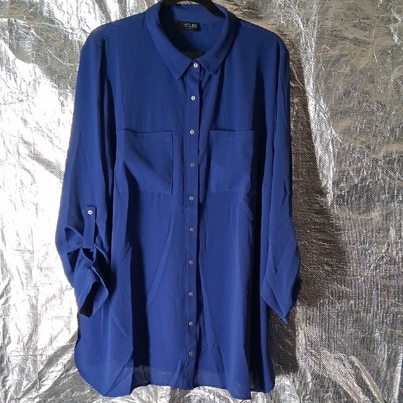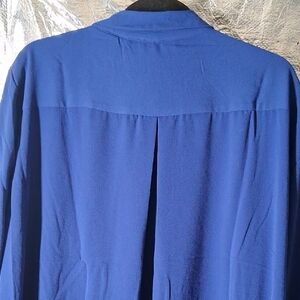 Stylish blue button-up blouse with long sleeves. Perfect for any occasion.