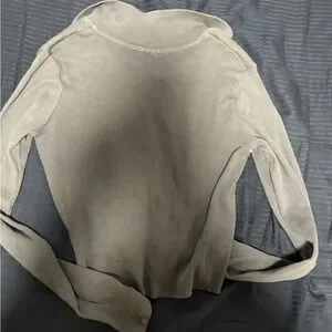 Stylish taupe ribbed cardigan with button-up front. Perfect for layering.