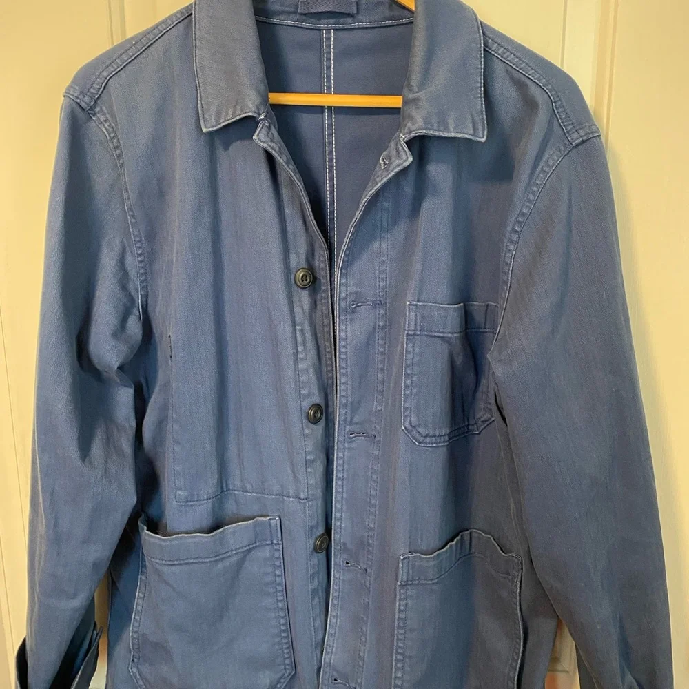 Stylish blue button-up jacket with front pockets. Perfect for casual wear.