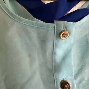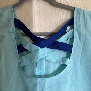 blue buttoned tank with gold buttons small mark on neckline cross cross detail at back size L