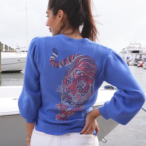 This fashionable cardigan sweater is the perfect addition to any wardrobe. Featuring the softest woven fabric, puffed shoulder detail and a crystal walking tiger design, you will be sure to make a stylish statement. Wear open over a t-shirt or buttoned as a top all on its own.