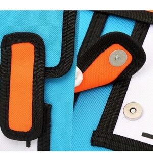 Unique blue backpack with cartoon style design. Features orange accents and a playful look.