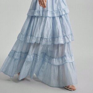 This blue casual skirt for women features a loose fit and long length with a layered and tiered design and ruffled details, offering a plain pattern and casual style.
