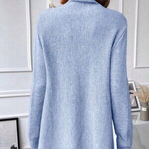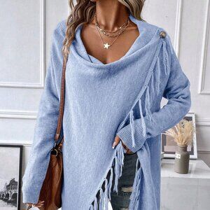 This casual sweater dress features an asymmetrical design with long sleeves and fringe tassel details. It is perfect for spring or fall and has a loose fit with a cowl neck. The blue color adds a touch of elegance to this plain, regular-length dress.