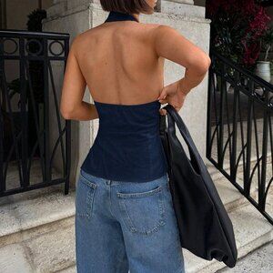 Blue Casual Women's Bow Tie Cutout Hollow Slim Fit vest top