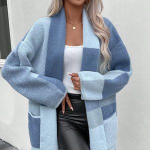 Blue Casual Womens Color Block Drop Shoulder Duster Cardigan