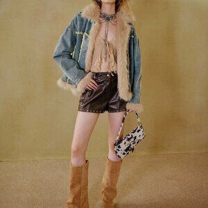 Blue Casual Women's Faux Fur Trim Raw Hem Denim Jacket