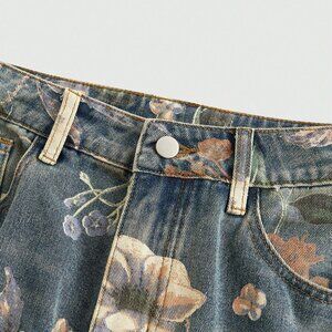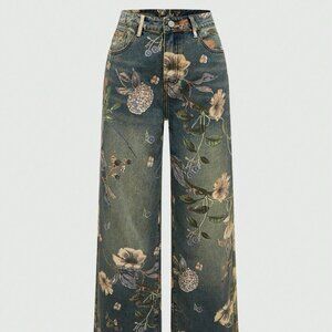 Blue Casual Women's Floral Printed Washed Loose Wide Leg Jeans