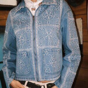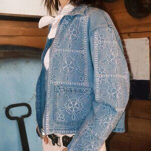 Blue Casual Women's Flower Embroidery Denim Jacket