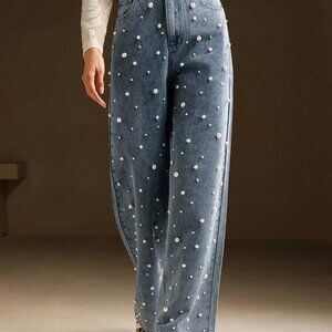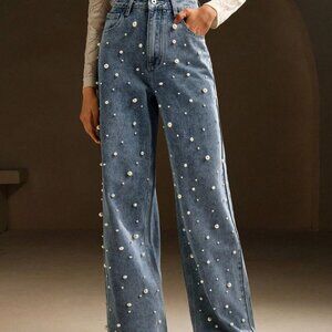 Blue Casual Women's High Waist Pearl Embellished Straight Loose Wide Leg Jeans