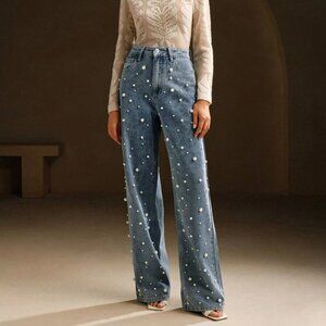 Blue Casual Women's High Waist Pearl Embellished Straight Loose Wide Leg Jeans