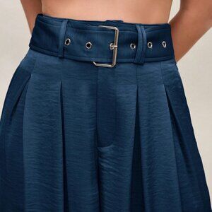 Elevate your style with these elegant long pants, featuring a high-waisted design, pleated satin fabric, and a wide leg fit. Perfect for making a statement at any party this late fall, these blue pants exude sophistication and poise.