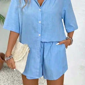Blue Casual Women's Leisure Solid Color Drop-Shoulder Shirt And And Shorts Set