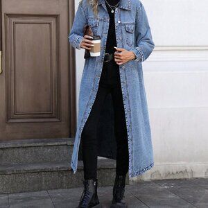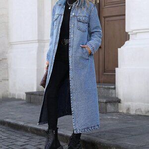 A long denim shacket with a shirt collar and regular fit, perfect for late‑fall casual looks. It offers a versatile Y2K‑inspired style in a rich blue hue, long sleeves and a relaxed silhouette ideal for students.