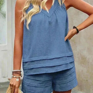 Blue Casual Women's Solid Color V-Neck Sleeveless Summer Top And Shorts Set