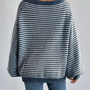 Blue Casual Womens Striped Pattern Drop Shoulder Sweater