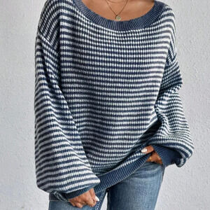 Blue Casual Womens Striped Pattern Drop Shoulder Sweater