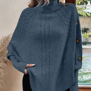 Blue Casual Women's Turtleneck Batwing Sleeve Button Detail Poncho Sweater top