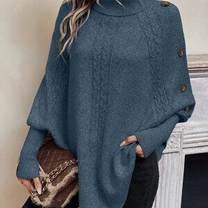 Blue Casual Women's Turtleneck Batwing Sleeve Button Detail Poncho Sweater top