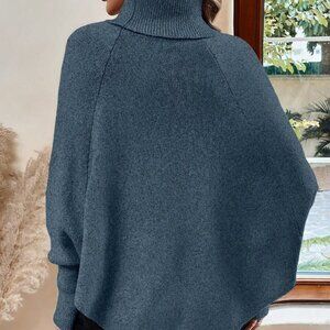 Blue Casual Women's Turtleneck Batwing Sleeve Button Detail Poncho Sweater top