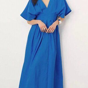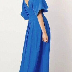 Blue Casual Women's V-Neck Back Hollow Bat-Sleeve Waist-Cinching A-Hem Dress