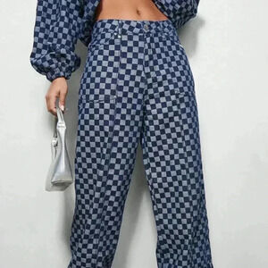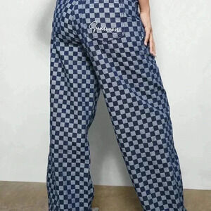 Blue Casual Women's Wide Leg Carpenter Checkboard Jeans