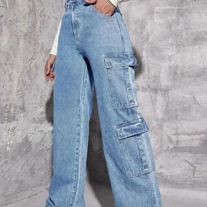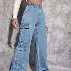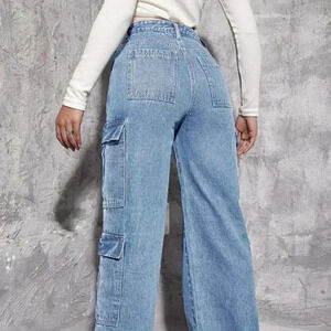 Blue Casual Womens Zipper Fly Flap Pocket Boyfriend Jeans