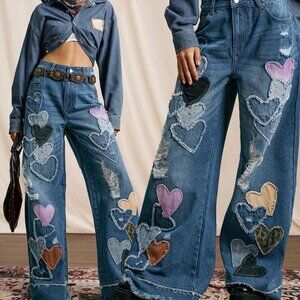 Blue Casual Women's patchwork Heart Pattern Washed Low-Rise Denim Jeans