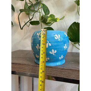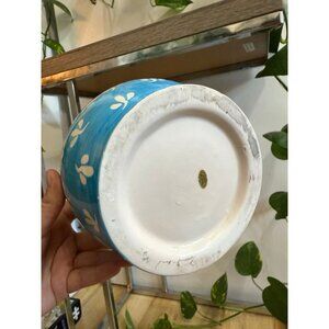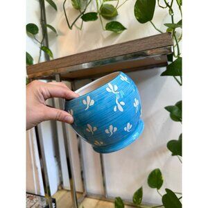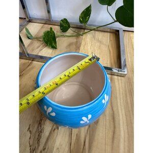 Bright and cheerful ceramic bowl featuring a glossy blue finish with white flower accents. Perfect for use as a planter, catchall, or decorative accent in any room.