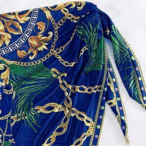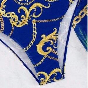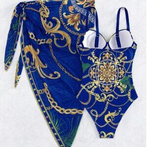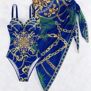 Blue Chain Print Push Up One Piece Swimsuit With Beach Skirt