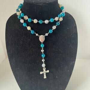 Blue Chalcedony Stone Miraculous Medal Rosary 3D Crucifix Catholic Silver Bead