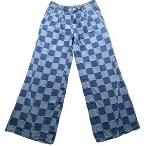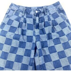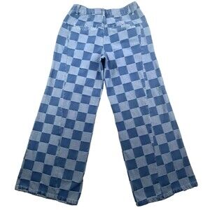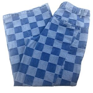 Stylish blue checkered flare jeans perfect for a trendy look. Comfortable and chic for any occasion.
