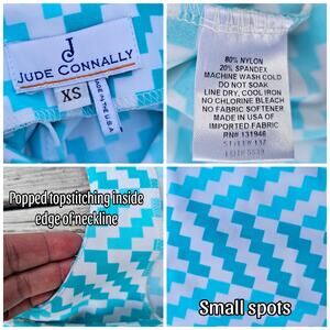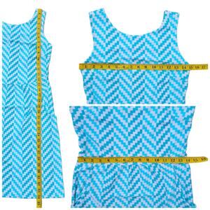 Stretch nylon easy care fabric in teal green, turquoise/aqua blue, white zigzag chevron pattern. Pullover style, sleeveless, lower scoop back, gathered elastic stretch waist, 2 side pockets, unlined. Issues noted in photos. Size XS dress by Jude Connally. Style: MaryPat #137