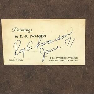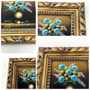 This is a small painting on masonite board. Approximately 5" x 7"; with frame: 8" x 9". This painting is highly detailed, super realistic flower bouquet in a luminous vase. Painting is signed at the lower left, "RGS." Sticker on the back says 1971.