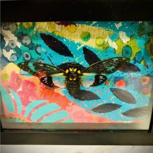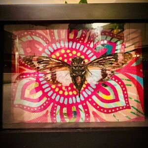 Set of three pinned up blue cicada from Thailand with funky fabric backgrounds.