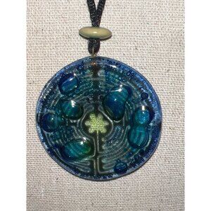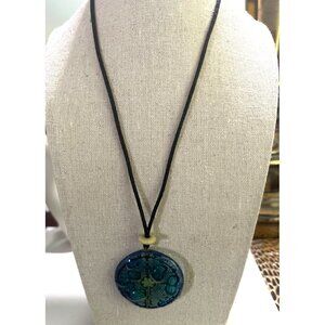 Blue Circle Glass Disc Pendant -- 18" . In excellent pre-love condition. Pendant is hung on a black cord, lobster claw clasp. A circle of glass in colors of blues and clear. Lightweight and easy-to-wear. Worn a few times. Measurement: 2"x2".