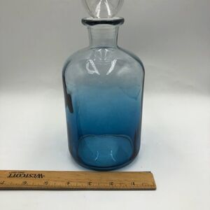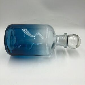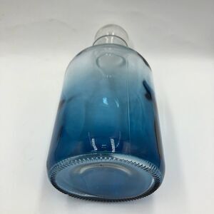 Blue Clear Ombre Look Glass Decanter Collectible Decorative Kitchen Container Glassware. Decanter is pre-owned but looks unused. Please see all photos for visible condition. No original box. No noticeable chips/cracks. Brand/age unknown. Top has a plastic stop. Approximately 8.75 tall with top without top 7 inches with approximately 4 inches wide at widest area. It doesn't state if food grade but it may be - or could be used for decorative purposes. Has a Ombre look - blue into clear glass.