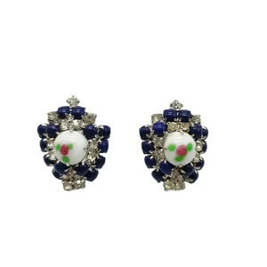 Blue Clear Rhinestone Pink Flower Guilloche Style Large Silver Tone Earrings
