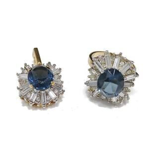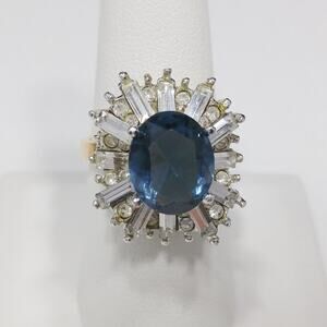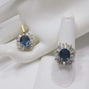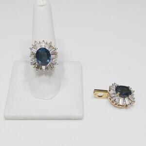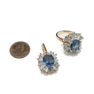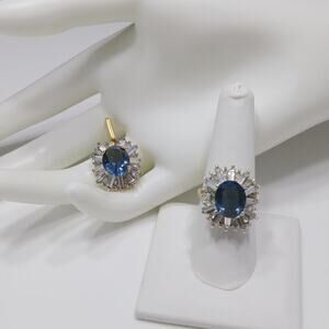 *Description: This is a beautiful crystal rhinestone set: a ring and matching pendant. The center of both is a blue oval faceted rhinestone which is framed in clear baguettes and chaton rhinestones. The band of the ring and bail is gold tone and the bail opens & closes. The pendant could be used as an enhancer as the bail opens.