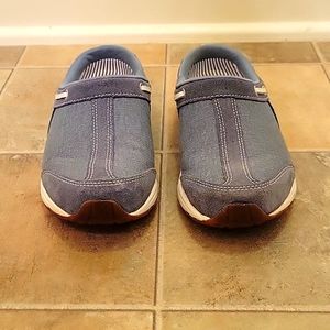 White and blue slip on clog shoes. Has been worn, but lots of life left.