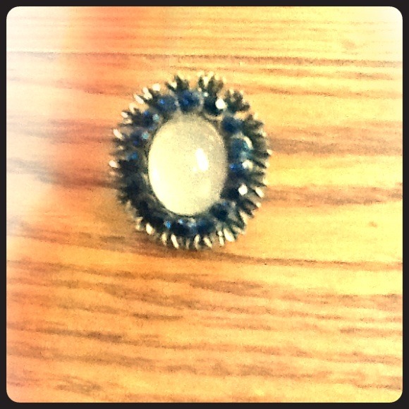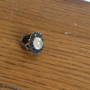 Pretty cocktail costume ring with clear pearl like stone in the middle and blue stones surrounding it. It has a stretchy band so it can fit almost everyone!