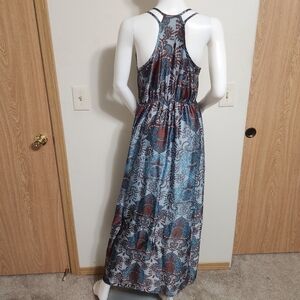 Super cute maxi dress in small. 100% polyester with a built in slip that's blue. Criss cross detail In the back with ruching under the bust, size small.