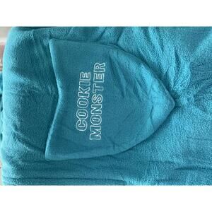 Includes a hood with large eyes and “Cookie Monster” applique on the front pocket.