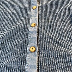 Stylish blue corduroy shirt with button-up front. Features a classic collar and long sleeves.
