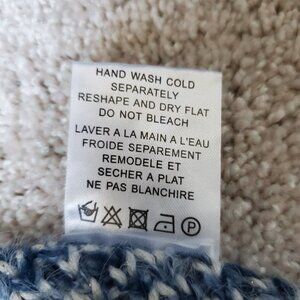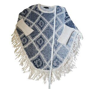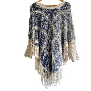 Minkas Blue & Cream Poncho with Sleeves Fringed Hem, Graduating Shades of Blue Size S/M. This unique piece does have sleeves. Is a classic poncho in that a shirt underneath would typically be worn.