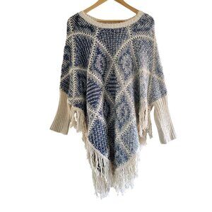 Blue & Cream Poncho with Sleeves Fringed Hem, Graduating Shades of Blue Size S/M